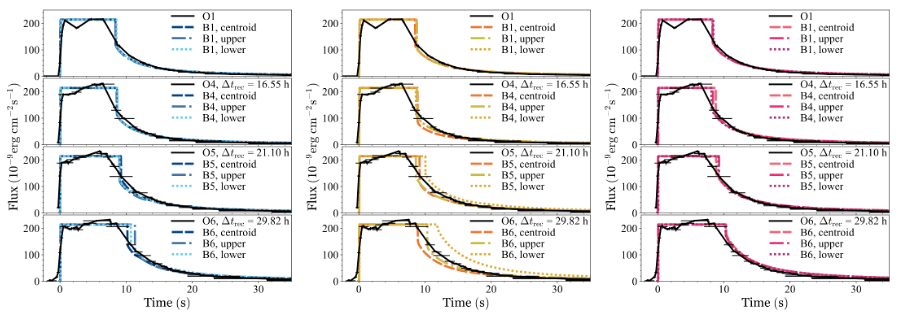 图2:SAX J1808.4−3658(2002年10月历元)的观测与模拟光球半径膨胀暴发光变曲线。左栏:模拟光变曲线基于Johnston等人(2017)的模型构建,使用了镓-63和铬-64质子俘获热核反应率的中心值和上下限。中栏:模拟光变曲线同样基于Johnston等人的模型,采用了镓-63和铬-64质子俘获热核反应率的中心值和上下限以及实验定出的22Mg(α, p)反应率。右栏:模拟光变曲线基于修复的光球半径膨胀暴发模型生成,使用了用于中栏的反应率。左栏体现出新镓-63和铬-64质子俘获热核反应率对光球半径膨胀暴发光变曲线的明显影响。